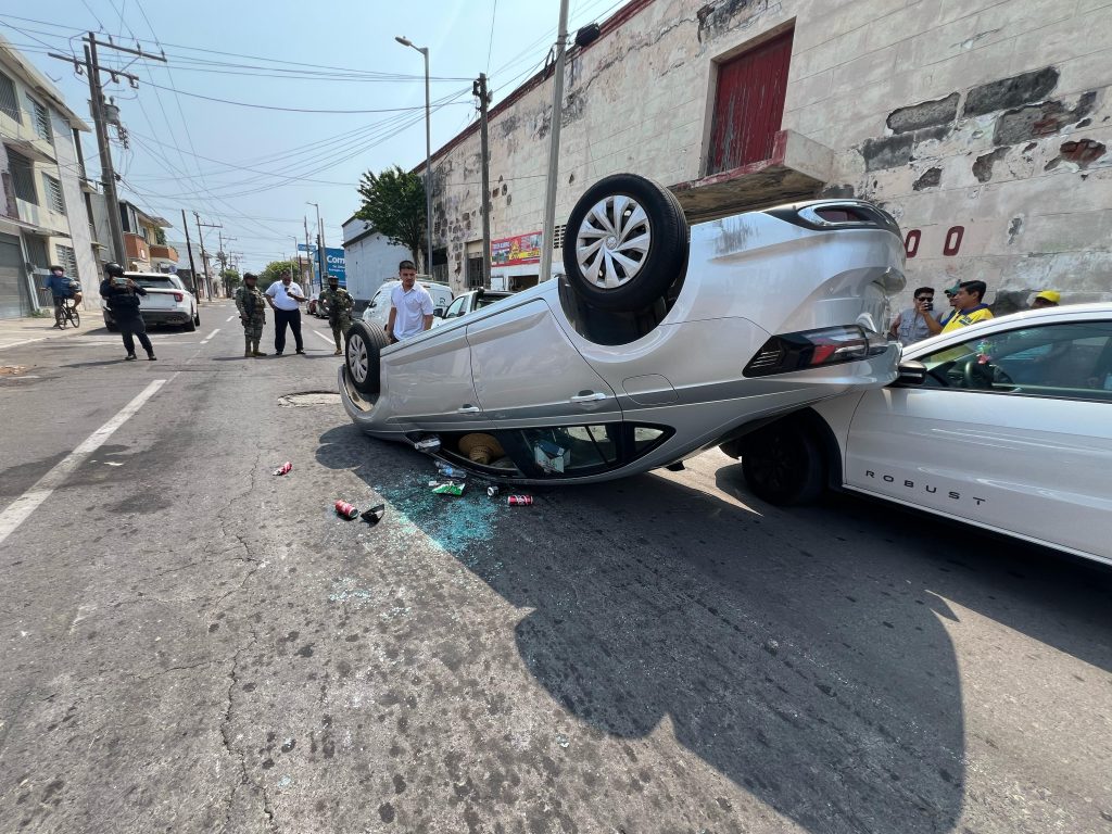 Veracruz, Ver.- Un par de turistas en evidente estado de ebriedad volcaron su automóvil Virtus color plata tras impactar a una camioneta estacionada sobre la calle Mario Molina casi esquina Jiménez.