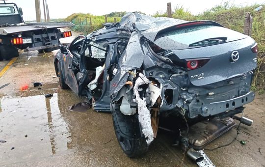 Jorge Hernández. Un brutal accidente automovilístico ocurrido sobre el Boulevard costero de Coatzacoalcos, donde un automóvil Mazda quedó hecho chatarra...