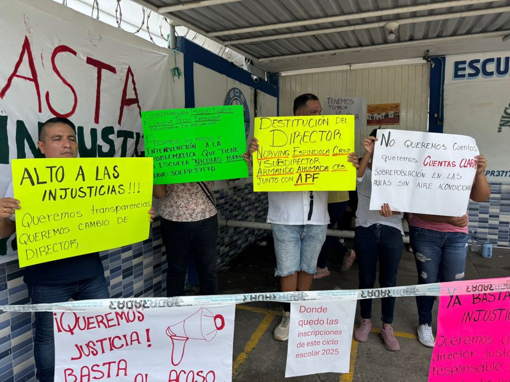 Veracruz, Ver.– 29 de septiembre de 2025.- Un grupo de padres de familia de la escuela primaria Nicolás Bravo, ubicada en la Unidad Habitacional El Coyol, tomó las instalaciones del plantel para exigir la destitución del director, Norving Espíndola Cruz, a quien señalan de presuntas irregularidades en su gestión.