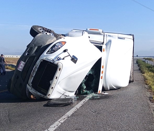 Operadores de la línea de emergencias 911 reportaron la mañana del lunes la volcadura de un tractocamión Freightliner color blanco, placas 97-8K.3N del servicio público federal, en el kilómetro 103+000.