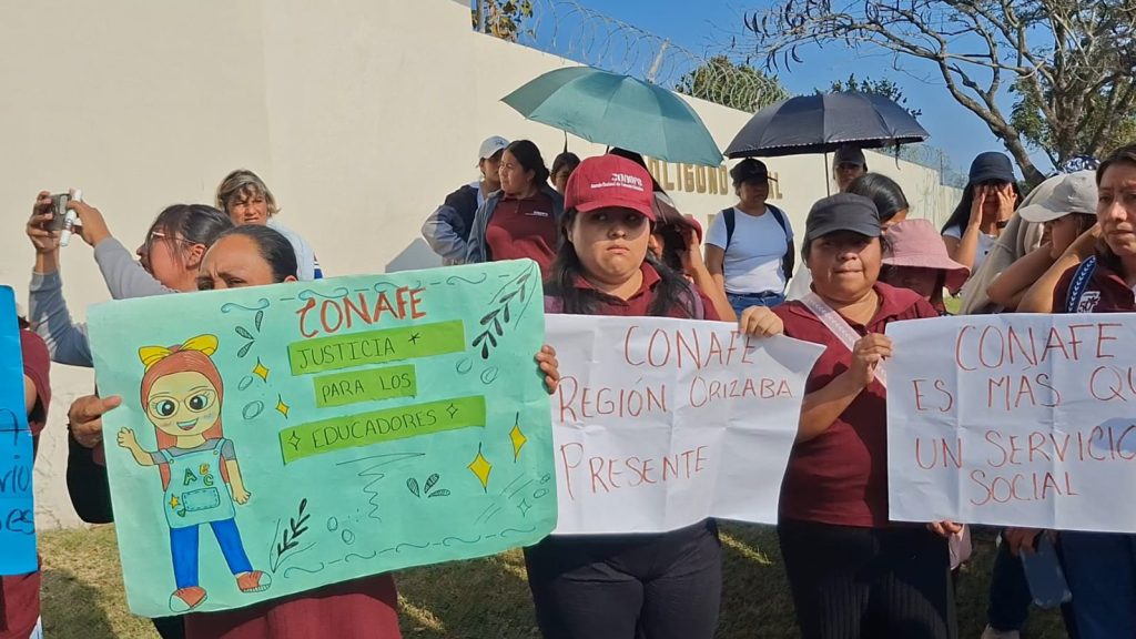 Veracruz, Ver, 23 de enero de 2025.- Durante la gira de trabajo de la presidenta, Claudia Sheimbaum por el puerto de Veracruz, maestros adscritos al Consejo Nacional de Fomento Educativo (Conafe) se manifestaron la mañana de este viernes para exigir salarios digno y mejores condiciones laborales.